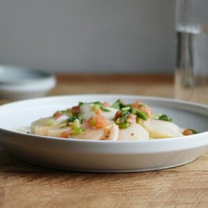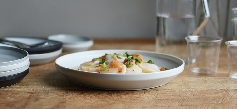 RIM has a distinctive rim design, incorporating essences of both Japanese and European tablewares. The wide range of shapes and sizes accommodate diverse dishes. Due to the raised rim, the plates can be used to serve dishes with sauce or juice.